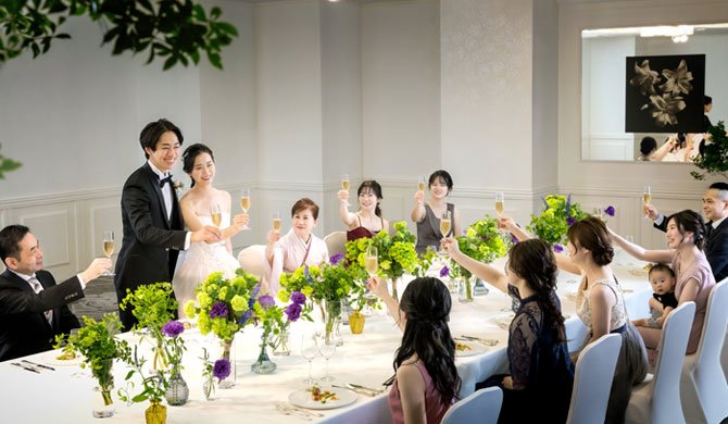 これまでおふたりを支え、見守ってくれた大切な家族や親族とテーブルを囲む、心を込めた「おもてなしウェディング」。