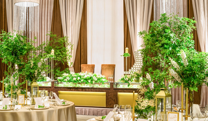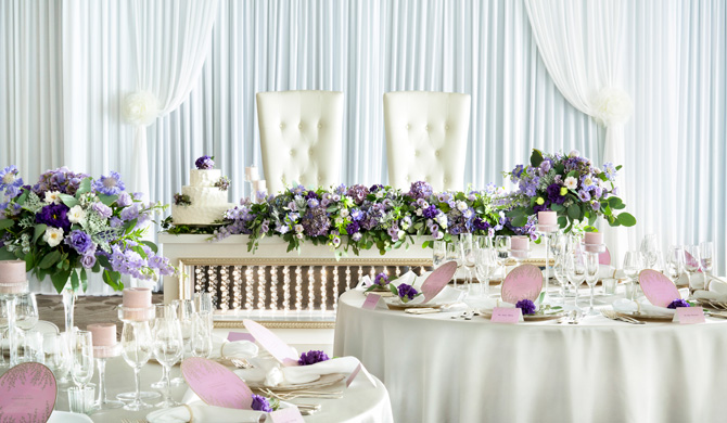 光に満ち溢れた会場をおふたりらしいコーディネートで彩って、美味しいお食事や会話を楽しむウェディングパーティーを。