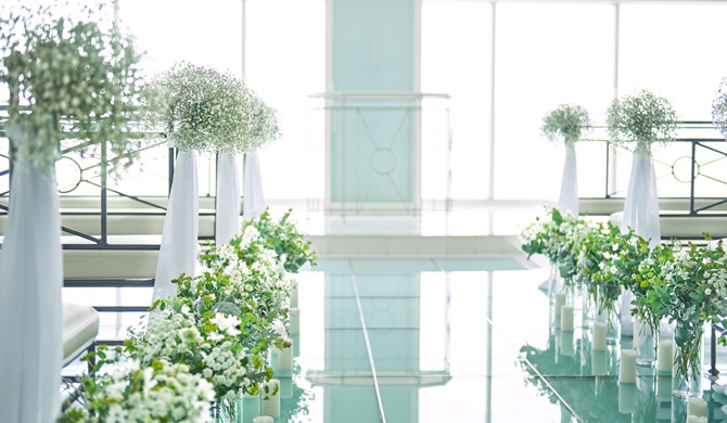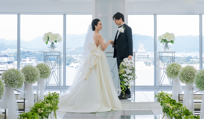 ホテルの最上階、地上60mに位置し、世界文化遺産「姫路城」を一望できるパノラマビューが目の前に広がります。大きな窓からはまるで明るい未来を映し出すかのような、清らかな光がおふたりを包み込みこれからの人生を彩り、幸福をもたらします。